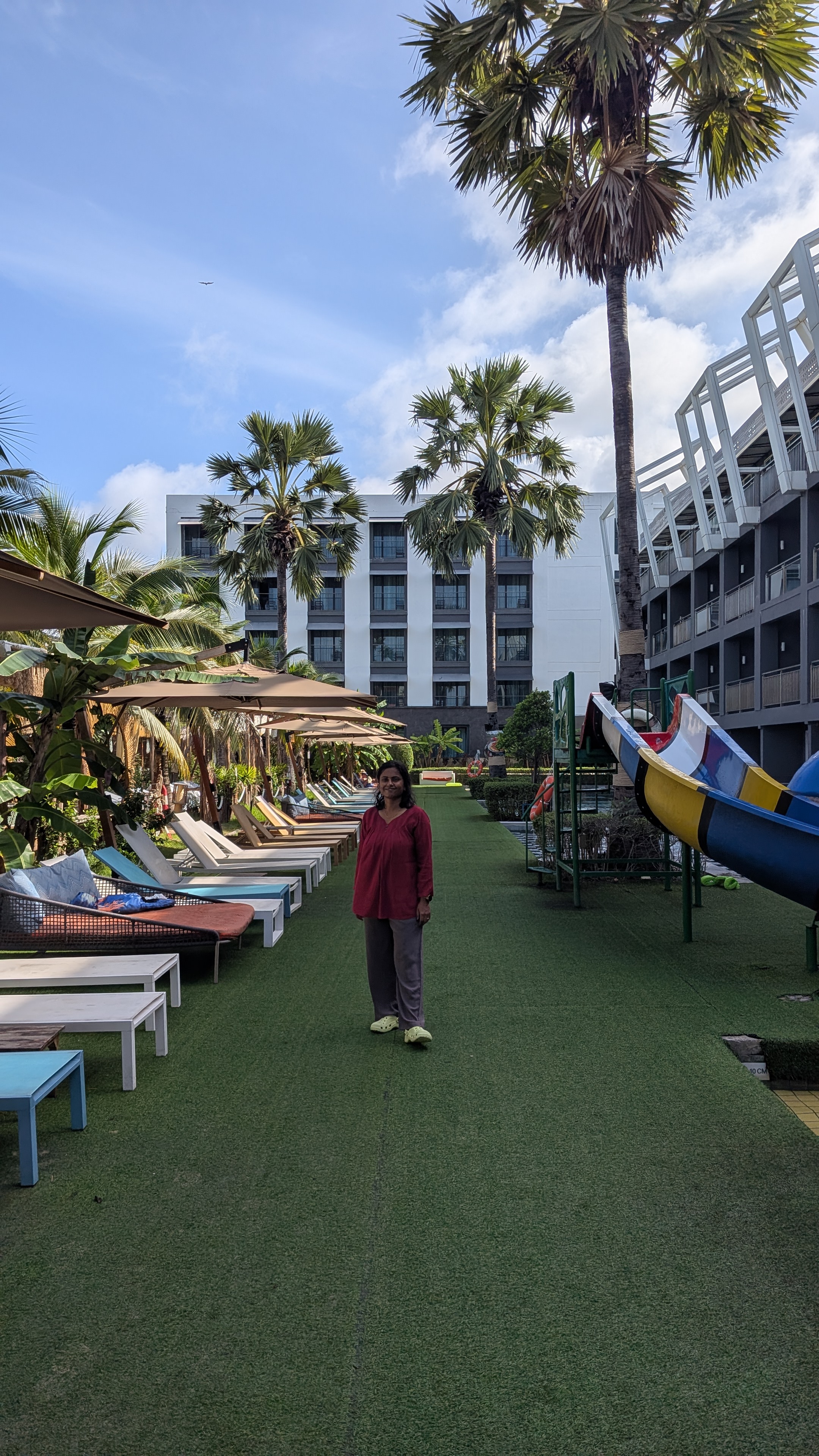 Our family consisting of my wife, 2 year baby and myself stayed here and had a wonderful overall experience. The check in staff were very helpful and shared correct information. They even upgraded us to a Family room which was amazing and had a partial view of the sea from the balcony. The room was comfortable and had a big bed enough to fit the 3 of us as well as a big bunk bed. The food (breakfast) which had a variety of English items was great, especially their waffles were amazing. The swimming pool is suited for kids with a slide and play area in the pool itself. At the entrance of the hotel, they have their main restaurant called Kiri along with a lot of smaller shops that sell fresh fruits. We had fresh cut mangoes twice everyday. Karon beach is walking distance from the hotel.